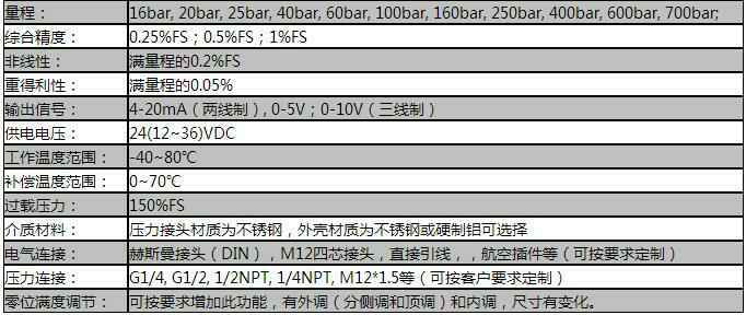 额定量程:6bar,10bar,20bar,50bar,70bar,100bar,300bar,500bar,700bar